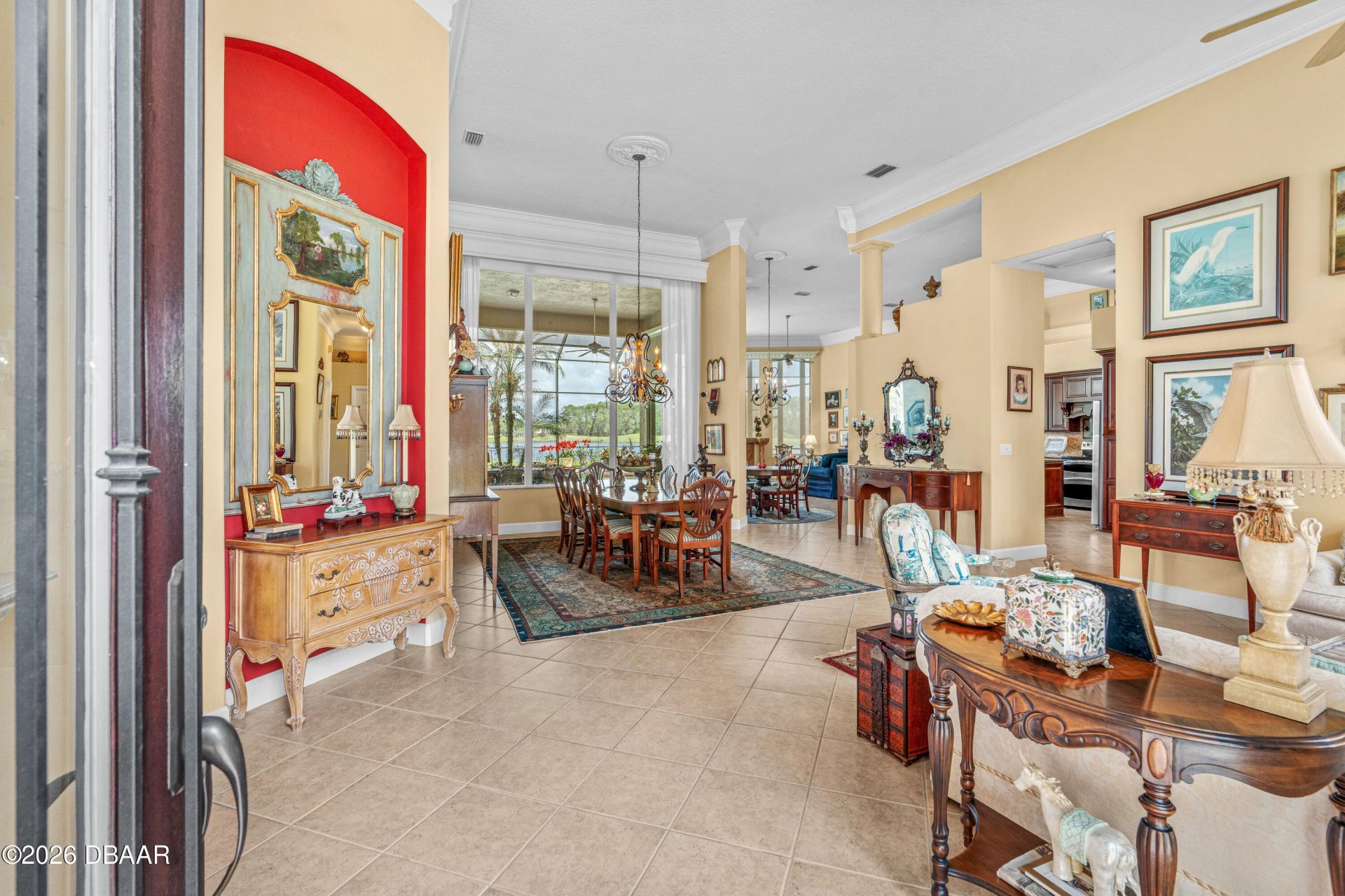 The TRIPLE VIEW-golf course, lake, preserve. Welcome to 1106 Oxbridge Lane, an exceptional 4 bedroom, 3.5 bathroom, 3 car garage estate home with a pool and elevated jacuzzi, .61 Acre lot, perfectly positioned with breathtaking golf course and lake views in the prestigious Plantation Bay Golf & Country Club. Enter through the custom double glass front doors and be immediately captivated by panoramic views of the pool, lake, and golf course, framed by soaring 14-foot ceilings and an open, light-filled layout. The formal living room showcases tile floors, expansive windows, custom drapes and blinds, and elegant double crown molding. The formal dining room is equally impressive with large windows capturing the serene views, custom chandelier, extensive trim work, tile floors laid on the diagonal, and 14-foot ceilings. The oversized kitchen is designed for both function and style, featuring granite countertops and backsplash, 42-inch all-wood dovetail soft-close cabinetry, GE Profile MORE ... stainless steel appliances including a built-in oven and built-in oven and range with double oven feature, stainless steel farmhouse sink, reverse osmosis system, separate dry bar area, additional built-in cabinetry, and a large walk-in pantry. The breakfast nook is surrounded by grand windows with continued trim work and tile flooring, offering incredible views. The family room features massive windows, extended crown molding, 14-foot ceilings, a gas fireplace, built-in surround sound, custom electric sun shades, and three sliders leading to the lanai. The private master suite is tucked away in its own wing with double door entry, a wall of glass sliders to the lanai, custom drapes and shades, and stunning views of the pool, lake, and golf course. The space is enhanced by 12-foot ceilings with crown molding and custom detailing. The updated master bath includes quartz countertops, dual vanities with a dedicated makeup area, jetted tub, large walk-in shower with mosaic tile accent and waterfall showerhead, private commode, and a grand walk-in closet with custom built-ins. Guest accommodations include spacious secondary bedrooms with walk-in closets, including a rear bedroom with incredible lake and golf views. Secondary bathroom feature extended vanities, tile tub/shower combinations, and designer finishes. The fourth bedroom, located on the master wing, offers a built-in desk area with 3rd bath with tile tub/shower combo. Hallways leading to the master include custom built-ins for added functionality. The laundry room is fully equipped with an additional dishwasher, large sink, abundant cabinetry, and folding space. Additional features include two hot water heaters (2020 and 2021),2 zoned AC system, Culligan water system, custom drapery throughout, and sunshades on family room windows. Step outside to a truly resort-style outdoor space featuring a grand covered lanai, oversized heated pool with elevated gas heated jacuzzi, koi pond with a newly updated liner and pump (March 2026), gas hookup for grilling, and sweeping views from every angle. A dedicated pool 1/2 bath enhances convenience for outdoor living. The oversized, deep three-car side-entry garage includes built-in cabinetry for storage. Situated on over half an acre, this property offers exceptional curb appeal with a large front yard, freshly curbed flower beds, lush landscaping, exterior landscape lighting, and a tile roof with full gutter system. Enjoy added privacy with no neighbor to the left, all located on a quiet cul-de-sac street lin