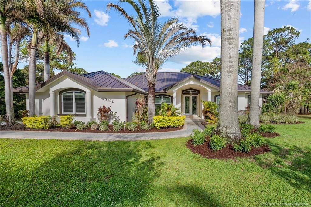 Nestled on a private 2.76-acre lot along an interior waterway with preserve views, this turnkey 4BR/2.5BA CBS estate is located within the highly sought-after gated Stuart West equestrian community. Positioned at the end of a cul-de-sac for added tranquility, the residence features soaring vaulted ceilings and a thoughtfully designed, open layout. The pool home is further enhanced by a convenient cabana bath, ideal for indoor-outdoor living. Extensively renovated, the home showcases new impact windows and doors, wood plank-style tile flooring, updated pool equipment, exterior trim lighting, a new water softener, and a whole-house electric generator for added comfort and peace of mind. Additional improvements include a 2018 roof and kitchen appliances just 3 years old. Residents enjoy the option of non-mandatory membership to The Cape Club, a premier golfer's retreat offering exceptional golf and dining. Ideally located near I-95, with convenient access for north & south bound travel.