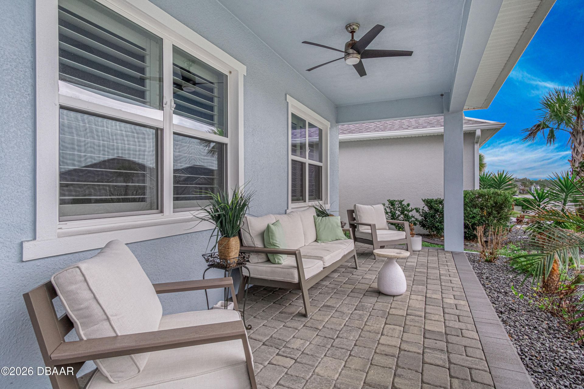Beautifully upgraded 4BR/3BA home on a desirable corner lot with a split floor plan designed for privacy and functionality. Open-concept kitchen, dining, and living area features high-end Café Appliances, a custom walk-in pantry with solid shelving (no wire racks), and additional storage for large dishware and cleaning supplies. Spacious living room includes a statement fan, remote blinds, and 4-panel sliders that fully open and tuck behind the wall for seamless indoor-outdoor living. Plantation shutters throughout. Tiled lanai with remote-controlled hurricane screens. Front lanai fits full seating. Oversized primary suite with large walk-in shower and closet. Guest/in-law suite with private bath plus two bedrooms sharing a bath. Separate den/office. Large laundry room with storage. No wire shelving in any closets. Sprinkler system, concrete curbing, and garage ceiling storage complete this exceptional home. Owner is a Licensed RE agent.