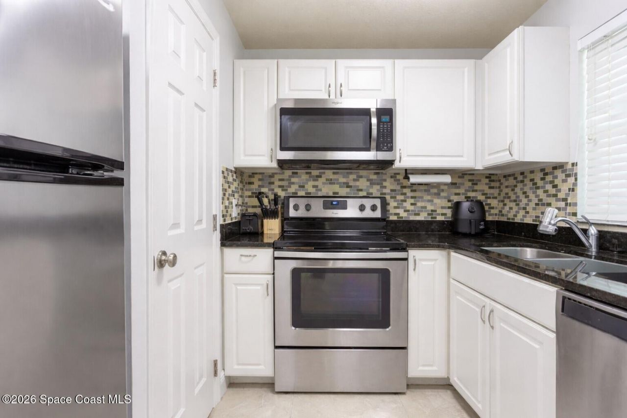 Nicely updated upstairs unit. Tile throughout. Kitchen features updated cabinets and granite countertops. Stainless steel appliances. Primary bedroom consists of walk-in closet, updated shower with deep tub, newer vanity with granite countertop. Guest bathroom also updated. Hurricane impact windows. Customer blinds. Tenant occupied until July at $1500.00 per month. Private unit in back of complex. Community pool, playground and basketball court. Convenient location to Kennedy Space Center, major highways, shopping and restaurants.