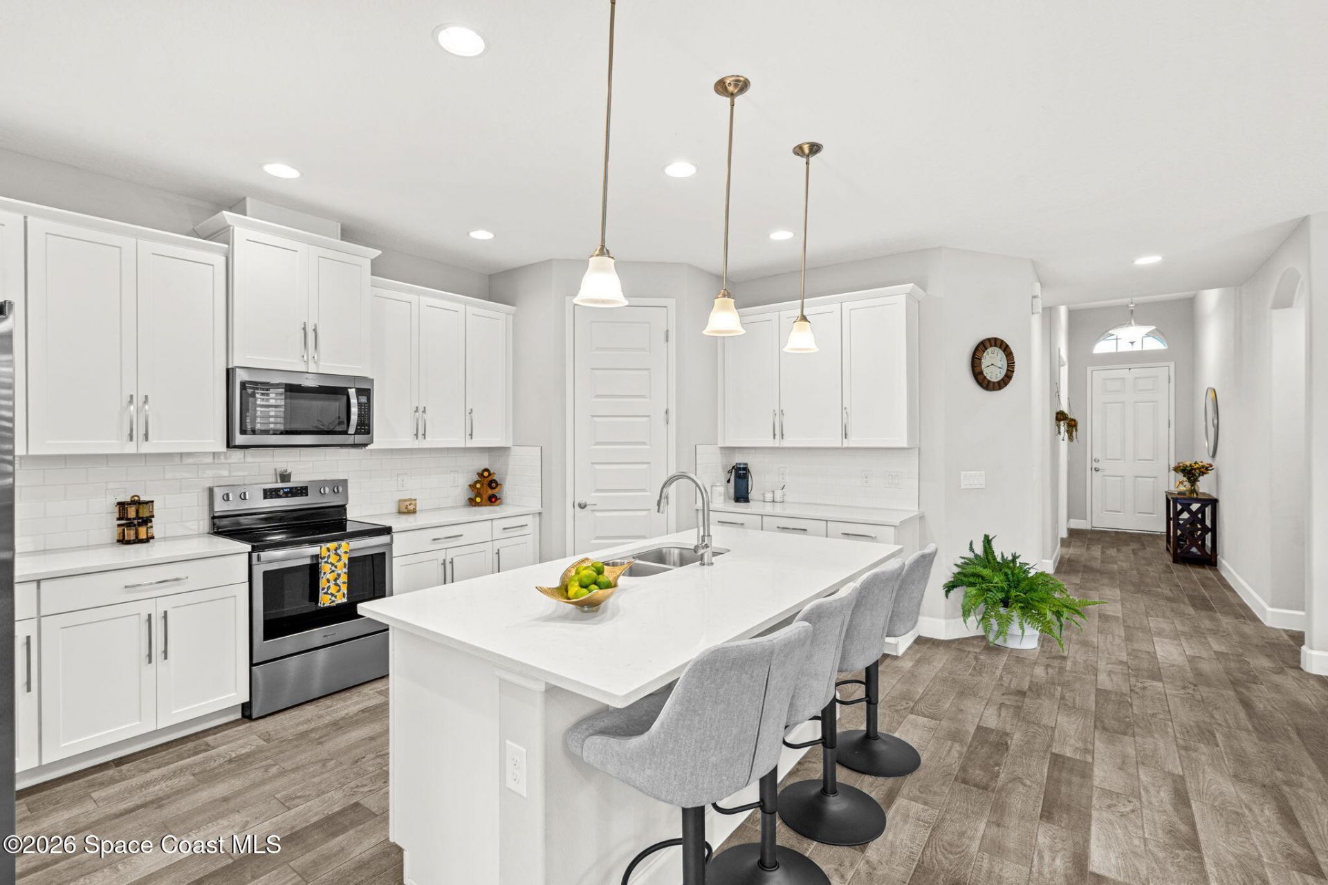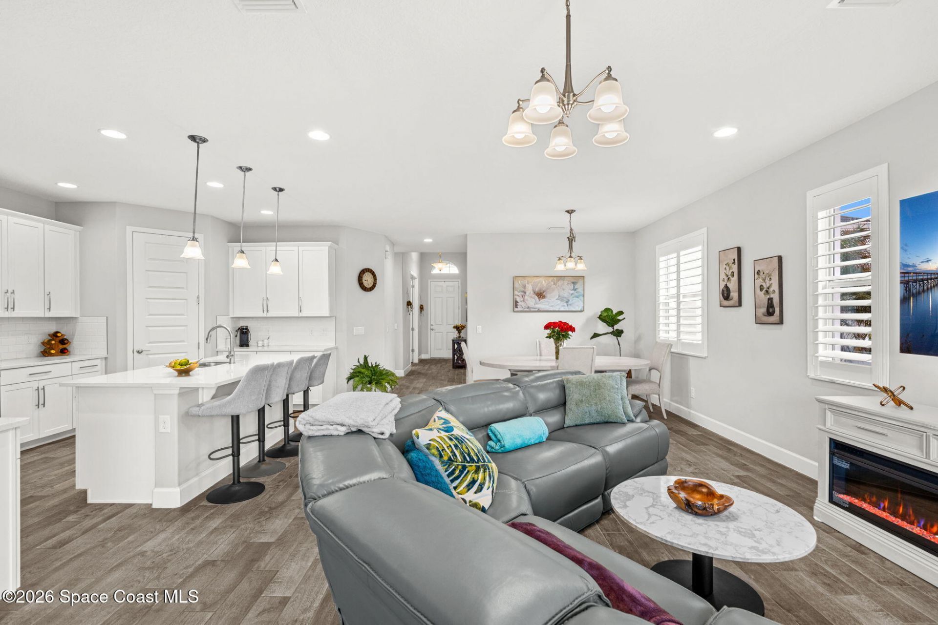 If youve been waiting for the perfect mix of peaceful waterfront living and everyday convenience, this home just feels right. Located in the vibrant Trasona West community in Viera, residents enjoy A-rated schools and resort-style amenities, offering the lifestyle people move to Florida for.This 4-bedroom, 2-bath home with 1,900 square feet features the popular Destin floor plan and offers space to truly live. Inside, youll find tile flooring throughout, along with a flex room that can easily function as a home office, playroom, gym, or additional living space. The modern kitchen features quartz countertops, sleek white cabinetry with pull-out drawers, and is pre-plumbed for a gas stove.The upgrades here are significant. Paid-off solar panels help keep electric bills low, the primary closet has been upgraded with custom organizers, and the garage features a finished painted floor for a clean, polished look. The home also features accordion hurricane shutters and impact windows across the front, providing added protection and peace of mind.Step outside to enjoy a screened-in patio overlooking peaceful water views, plus a fully fenced backyard with plenty of room to relax, entertain, or let pets run. Its quiet, private, and exactly what you want at the end of a long day.The HOA maintains the lawn, sprinklers, and mulching, making maintenance easy and stress-free. With golf cart access to shops, restaurants, walking trails, and even school pick-up and drop-off, this home truly offers the best of the Viera lifestyle. Beyond the home, the community delivers a resort-style pool, clubhouse, tennis courts, pickleball, parks, and more.