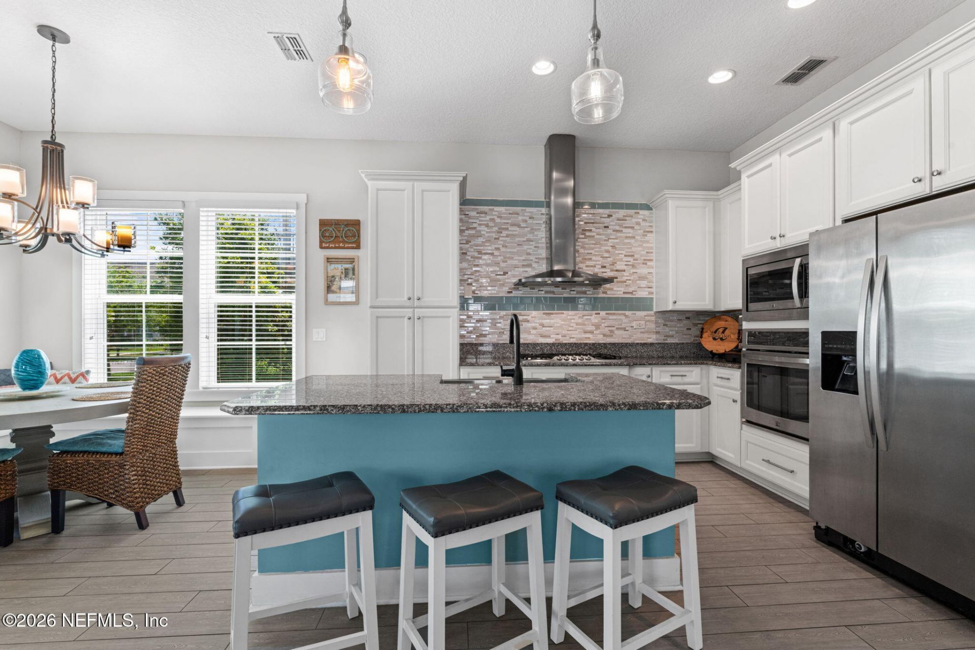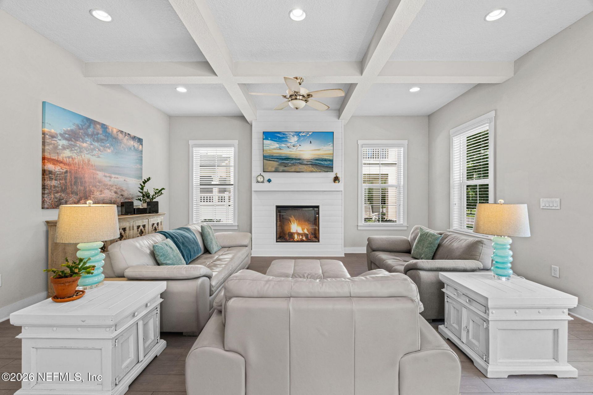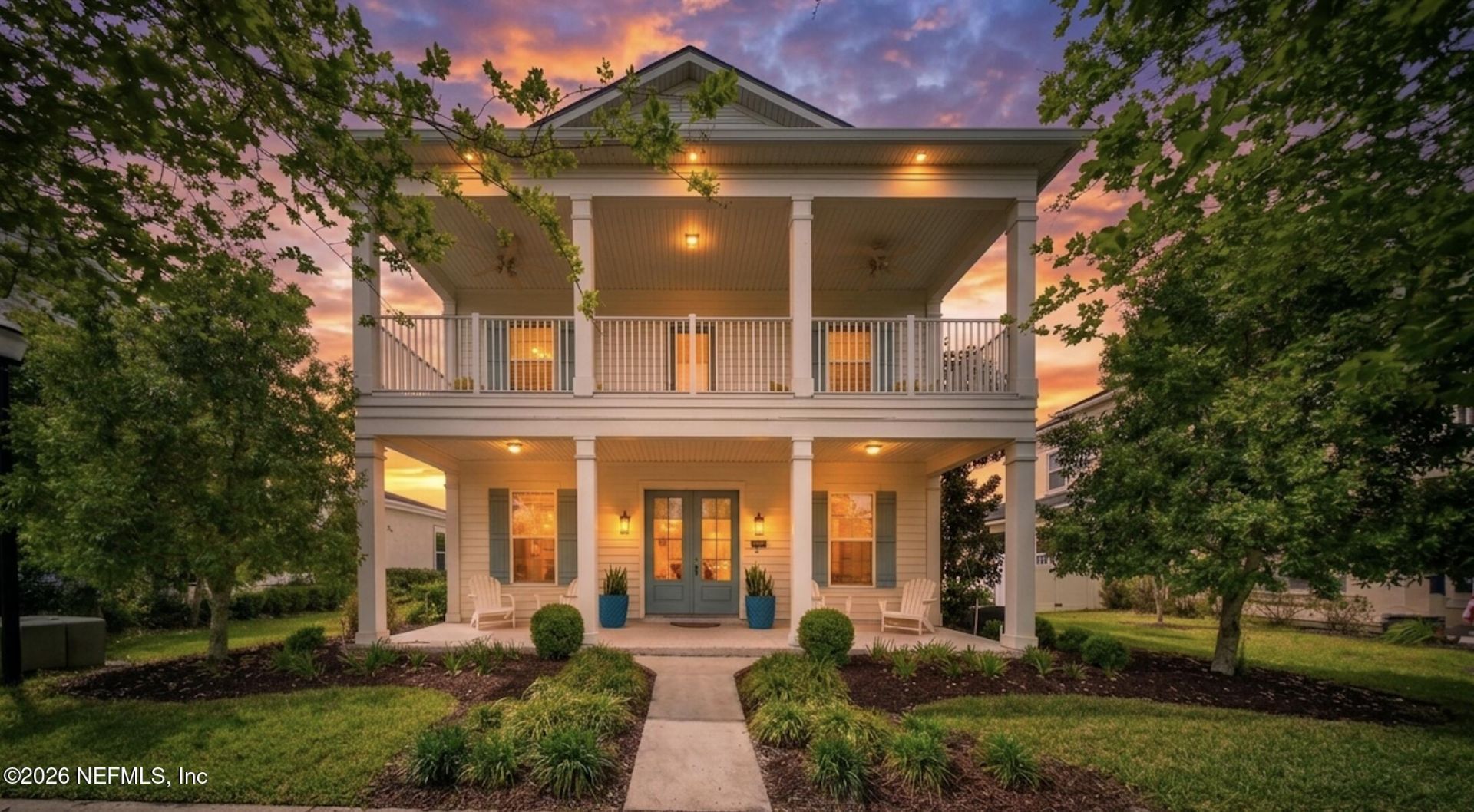 Just imagine arriving to your coastal Greek Revival home defined by its iconic columns, sweeping porch, & upper balcony. Inside, the chef's kitchen features a gas cooktop, soft close cabinetry, & flows into the dining area with a built in window bench. The family room features a coffered ceiling & a shiplap-framed electric fireplace. The main floor master suite is your sanctuary & the master bath includes a freestanding soaking tub & a walk-in shower with a bench & dual showerheads. Upstairs, 2 bedrooms & 2 flex rooms lead to an expansive upper balcony, where fresh Florida air make it clear why this home was designed the way it was. What you might not notice from the photos is how truly move in ready this home is. With laminate & tile flooring (no carpet), a water softener, an epoxy garage floor & gutters, the maintenance is as effortless as the lifestyle. All major appliances convey. Enjoy A Rated Schools, a pool, fitness center, racketball & a dog park behind the gates of Markland.