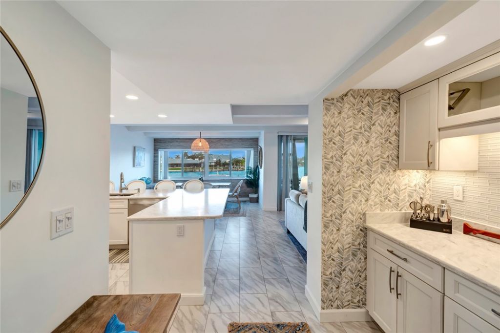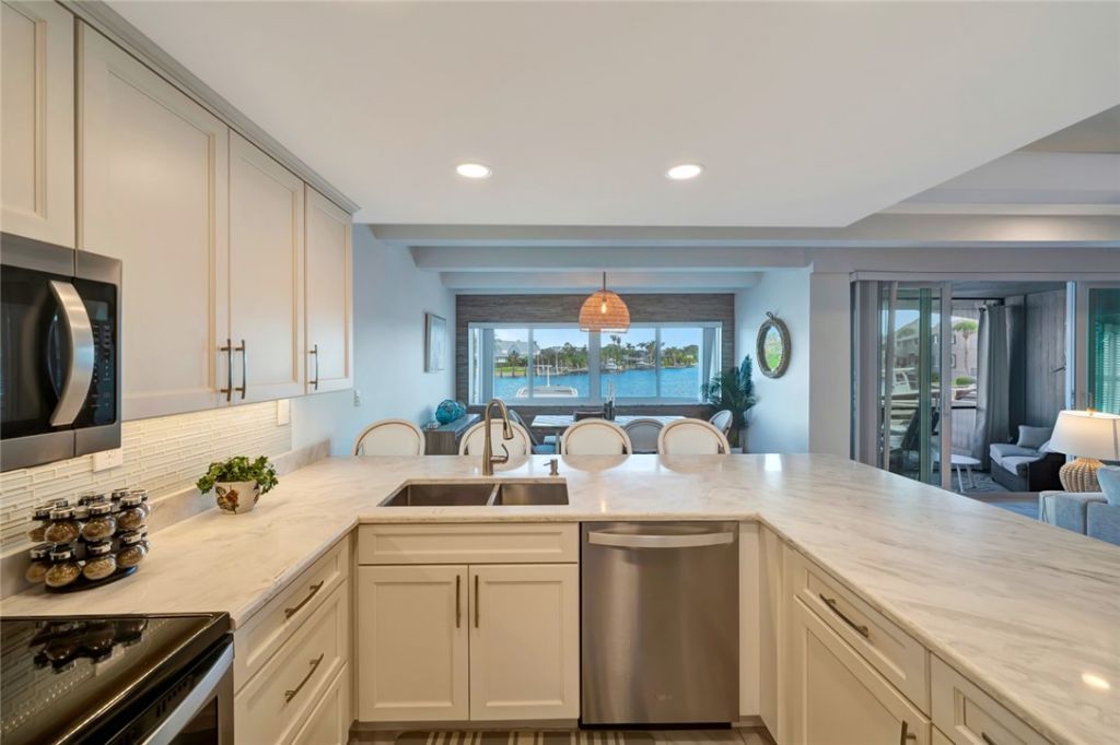 1st Floor end unit, beautifully reimagined in 2019, offering exceptional waterfront living with 2 deep-water docks, each accommodating boats up to 41. A floating Jet-dock ideal for kayaks or small boats is included. Take in stunning views from the condo, screened porch & open patio. Primary bedroom presents water views, a cathedral ceiling & walk-in closet. Impact glass windows/sliders, newer metal roof & direct access to your dock. Community perks: saltwater pool, clubhouse, 24-hr security patrol & Moorings private beach access. One dog/cat up to 50lbs allowed. Sizes approx./subj. to error.
