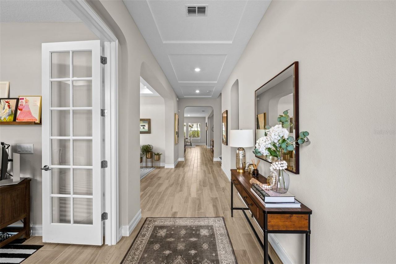 Welcome to luxury living in the exclusive gated community of Tarramor, in the top-rated Steinbrenner school district. This stunning 5-bedroom, 3.5-bathroom residence immediately impresses with its Mediterranean style, sophisticated barrel tile roof, 3-car garage, 10-foot ceilings, elegant 8-foot doors, and tray ceilings throughout. The heart of the home is a chef's dream, boasting an oversized 6-by-9-foot kitchen island, premium cabinetry with soft-close drawers, and a striking glass tile backsplash complementing a large farmhouse sink. Culinary enthusiasts will adore the premium GE Profile appliance package, which includes dual built-in convection ovens, gas cooktop, built-in microwave, convenient wine fridge, and a roomy walk-in pantry all supported by a whole-home water softener and a dedicated kitchen reverse osmosis system. The luxurious primary suite serves as a private sanctuary featuring a spectacular double tray ceiling illuminated by a large, statement light fixture. Its spa-like en-suite bathroom is a true masterpiece, equipped with a split quartz dual vanity, a separate deep soaking tub, an expansive walk-in shower with rainfall shower head, and a massive custom-built-out primary closet that provides abundant storage. Not only is there a designated office space, enclosed by chic glass French doors, but there is also a spacious dedicated dining room for enjoying meals. The upper level is brilliantly designed to accommodate family and guests, anchored by a versatile loft and bonus room that opens onto its own separate covered balcony. Bedrooms 3 and 4 enjoy shared access to an additional covered balcony, while bedrooms 2 and 3 are perfectly connected by a luxurious Jack-and-Jill bathroom complete with a dual vanity. Step outside to experience your own private resort within a sprawling screen enclosure. The outdoor oasis features a magnificent, heated saltwater pool complete with a relaxing tanning ledge with bubbler, sunken spa, custom travertine decking, accent lighting, and covered lanai perfect for year-round entertaining. Tarramor offers a lifestyle of ease and elegance. Residents enjoy exclusive access to resort-style amenities, including a heated pool, a modern clubhouse with a catering kitchen, and a fully equipped fitness center. Perfectly positioned for adventure and convenience, the community is just minutes from the Suncoast Trail and TPC Tampa, with easy access to the Suncoast Parkway and the Tampa International Airport.