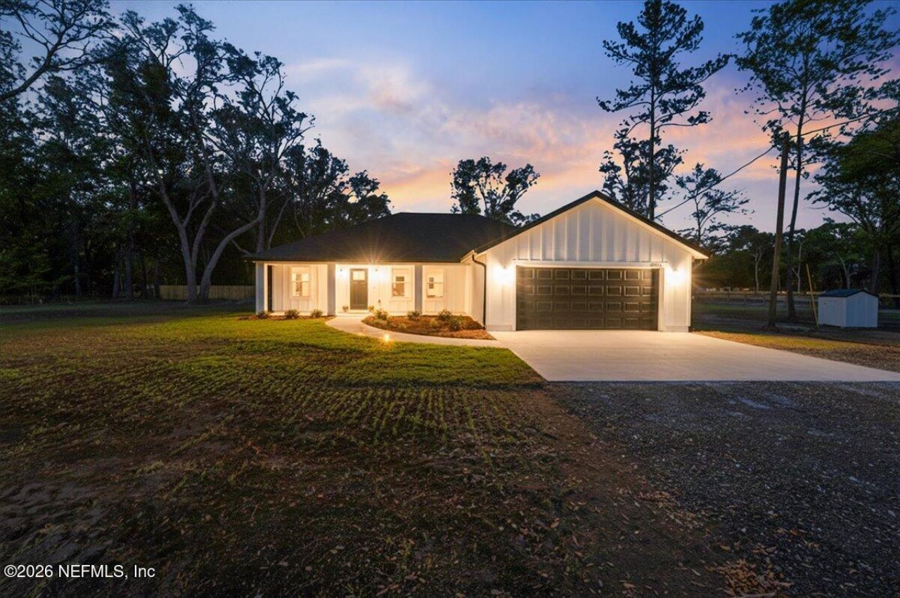 This stunning NEW build offers the perfect blend of modern design and peaceful country living, situated on a fully fenced .86-acre lot with a gated entrance.You'll love the eye-catching white board and batten exterior with black gutters and tricorn black garage door. Inside the vaulted ceiling open living complete with recessed lighting, energy-efficient windows including 2-in blinds, spray foam insulation, and a brand-new AC system for year-round comfort. The heart of the home is the beautifully designed kitchen, showcasing granite countertops, 42'' shaker-style cabinets with crown molding, and black stainless appliances. Cali Oak LVP Flooring throughout.Retreat to the primary suite, where relaxation awaits with a luxurious soaking tub, a stunning glass walk in shower with gold fixtures and custom walk in closet. Enjoy 2430sqft under roof with front and back covered porches to enjoy and a 2 car garage for toys.no HOA or CDD, Bring your boats, goats, dogs & chickens.